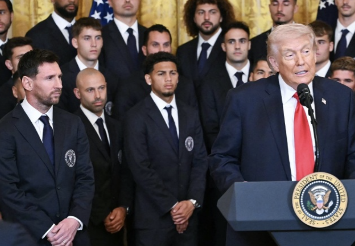 上赛季,梅西带领迈阿密国际获得队史首个联赛冠军。随后,他们按照惯例前往美国白宫,与特朗普会面。梅西也接受邀请,与全队一同前往。在白宫的东厅,特朗普发表讲话,欢迎了迈阿密国际全队的到来。